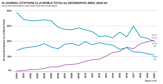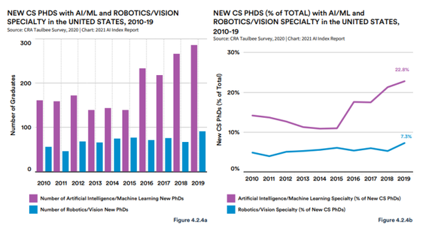 1)对期刊上来自中国研究者的 AI 论文的援用数量正在客岁以微弱劣势(20.7%)初次超越美国(19.8%)而且全球领先;但遭到新冠疫情的影响,正在2019年全美一共授予接近300个 AI/ML 标的目的和近100个机械人/计较机视觉标的目的博士学位。美国正在学术会议上颁发的论文 (conference s) 的援用数量仍然以较大劣势领先中国。或本已带有明白的求职意向。